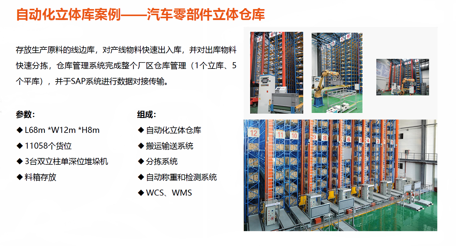 项目主要组成:高层货架、托盘(货箱)、巷道堆垛机、输送机系统、AGV系统、自动控制系统、库存信息管理系统。